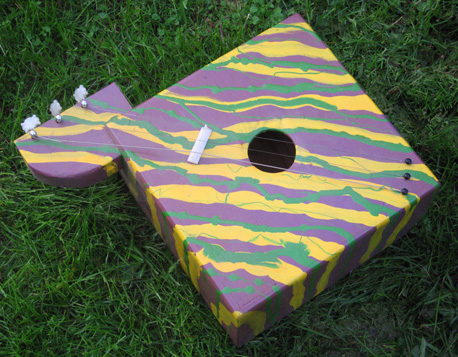 I found the wooden box at a teacher's estate sale in March of 1997. I cut out the hole (accidentally off-center a bit), fashioned the crude 2" x 4" peg and attached the tuners. The free-floating bridge is plastic trim from who-knows-where. I used one D and two G electric guitar strings. The tuning is something else. I tried to attach a buzz resonator in a side hole I made. But it didn't work. You play it by picking the strings on the left side of the bridge with your left hand and vice versa. You can use banjo finger-picks if desired. You can also slap the box.