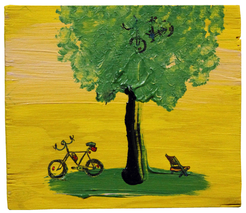 | About - Shows | ![]() Bike in Tree 6 1/2" x 5 1/2" / acrylic and ink on wood / 2010 |