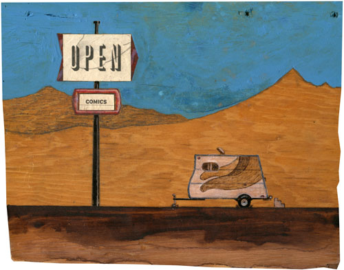 ![]() Open Comics 9" x 7" / acrylic, newspaper and ink on wood / 2003 original art: Sold |