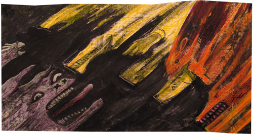 ![]() Creature Conflict 32" x 17" / acrylic and pastel on paper / 2005 |