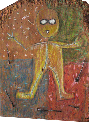 ![]() Dennis Takes on Math 10" x 13" / acrylic, pencil and nails on wood / 2002 |