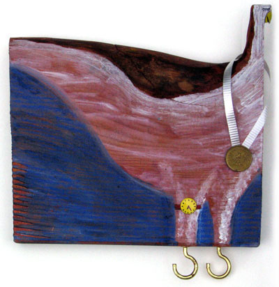 ![]() He Got A Watch 7" x 7" / acrylic, pencil, ink, ribbon, coin, thumbtack and hooks on wood / 2006 |