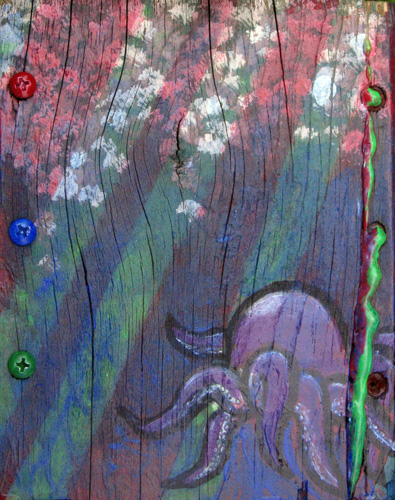 ![]() Octopus Plots Escape 6" x 8" / acrylic, ink, screws and insulation foam on wood / 2007 |